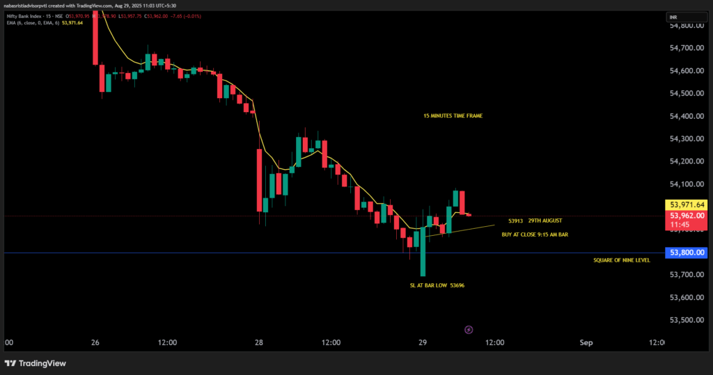 Today on 9:15 bar closing price is entry point stop loss is same bar low, Banknifty given a long trade using Square of nine level. Mr. W D Gann given very much important to Square of nine level for price analysis.